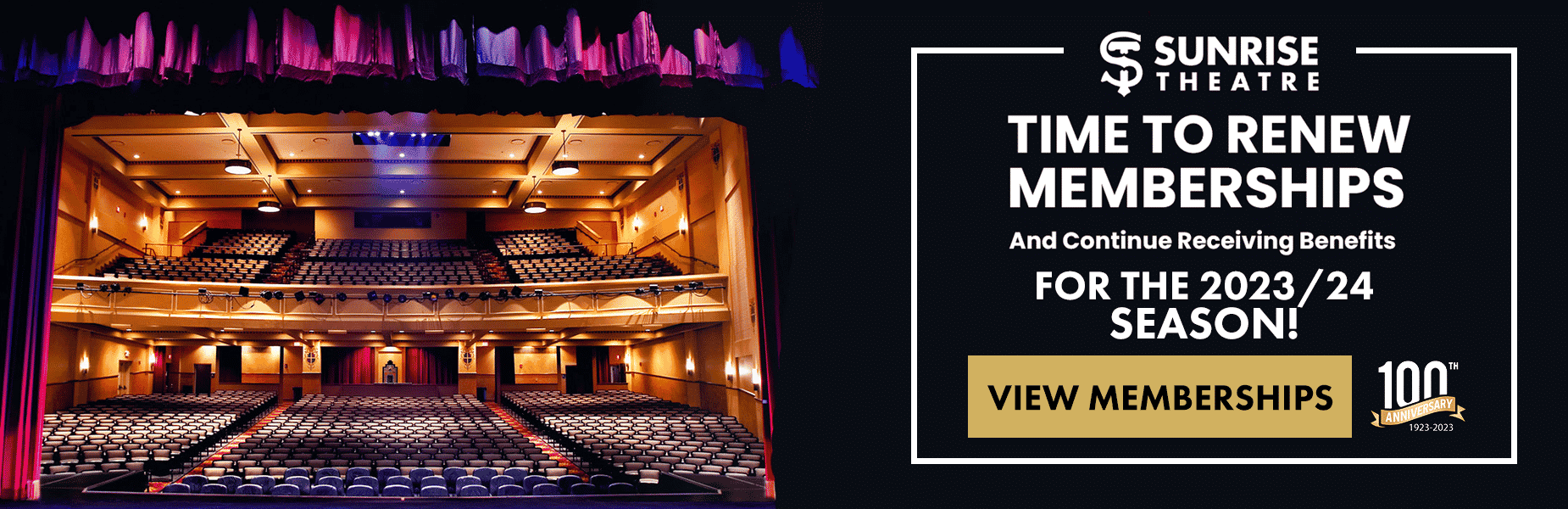 Your support as a member of the Historic Sunrise Theatre will be greatly appreciated. Like all performing arts theatres, ticket sale revenues cover less than one-half of our operating costs.
