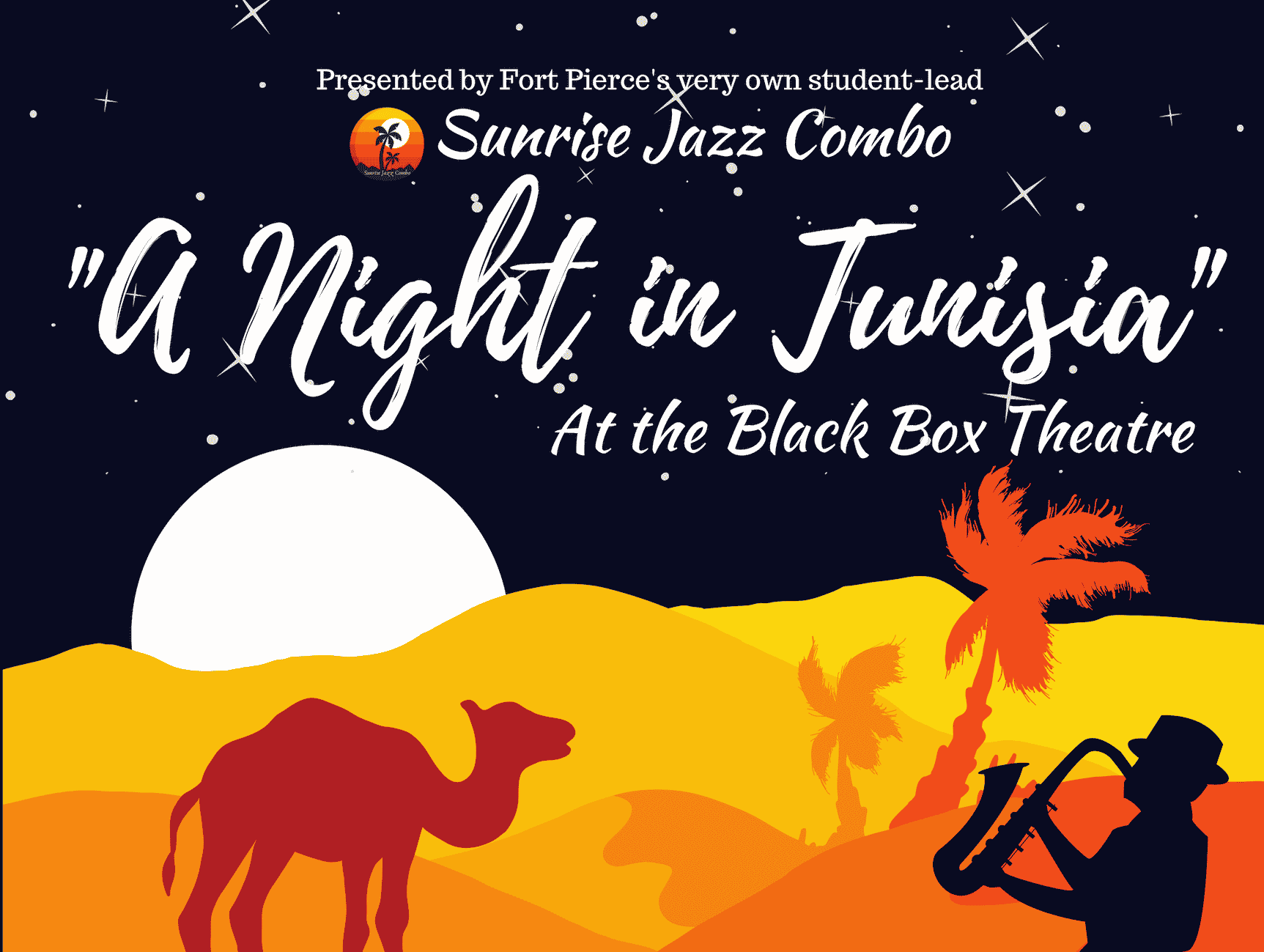 “A Night in Tunisia at the Black Box Theatre” is a show of modern and classic jazz, presented by Fort Pierce’s very own student-lead ensemble, the “Sunrise Jazz Combo.” The young ensemble has performed, and won first prize, in several competitions at the national level. This ensemble puts feeling into their music and kMain Theatrews that jazz is about being in the moment, and comes from the soul.