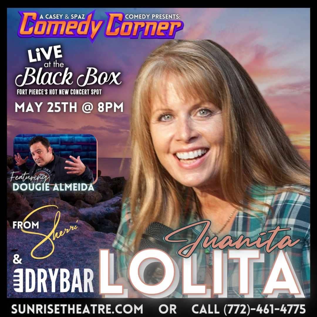 Comedy Corner Live at the Black Box hosted by Casey Peruski and Spaz!  Saturday May 25th at 8pm – Tickets $25 Advance $30 day of the show  Headliner Juanita Lolita! Winner of 2024 Sherri Shephard Day Time talk show Comedy Contest Women Over 50! Dry Bar Comedy Special, ABC, CTN and more Juanita Lolita’s comedy career began when a coworker signed her up for an open mic night. Within one year she was performing for over 7000 women at a church conference in Atlanta and since then has performed throughout the southeast. Just last month Juanita was invited to compete on Day Time TV’s Sherri Shephard Show in the Women over 50 Comedy Contest! After several episodes Juanita won the whole contest on National TV! Look for her in tour with Sherri! She also has a hit Dry Bar Comedy Special! Also was voted Tampa’s funniest female and has been featured on CTN, ABC news and several radio stations. Her Latin flair and hillbilly background have quickly become a crowd favorite. Juanita takes pride in the fact that she can make you laugh hysterically without profanity. Her comedy focuses on observations from everyday life that we can all relate to and she closes out each show with her much anticipated ‘list of things she doesn’t understand’. Feature Dougie Almeida Hailing from Queens, New York, Dougie Almeida spent most of his adult life as a corporate presenter for one of the largest financial planning firms in the country. His specialty was taking lifeless insurance presentations and transforming them into works of comic art. In his spare time, he fought as an ISKA Heavyweight Muay Thai Kick boxer, retiring at 10-0 and earning the title “Always Dangerous”. So, what do you get when you cross an inventive corporate executive with a retired kick boxer? A stand-up comedian, of course! Winner of Improv’s New Faces of Comedy & participant in various comedy festivals, like; Laughing Skull Comedy Festival, Gilda’s Laugh Fest, SLO Comedy Festival, Laugh Your Asheville Comedy Fest. NOHO Comedy Fest. & Boston Comedy Festival. Semi Finalist in Cleveland Comedy Festival 2013, Laughlin Laughfest 2014 & Finalist in World Series of Comedy Main Event 2015. Recently, Dougie appeared on “Jimmy Kimmel Live” on the segment, “Wall of America”. Prior to taking the stage, Dougie gauges his audience, reaches into his vault and prepares his onslaught of humor. Once on stage, he delivers blow after blow of hilarity, hitting the audience with punch line after punch line. His wit and stage presence are second to none. One thing is always certain – Dougie Almeida will KNOCK YOU OUT!