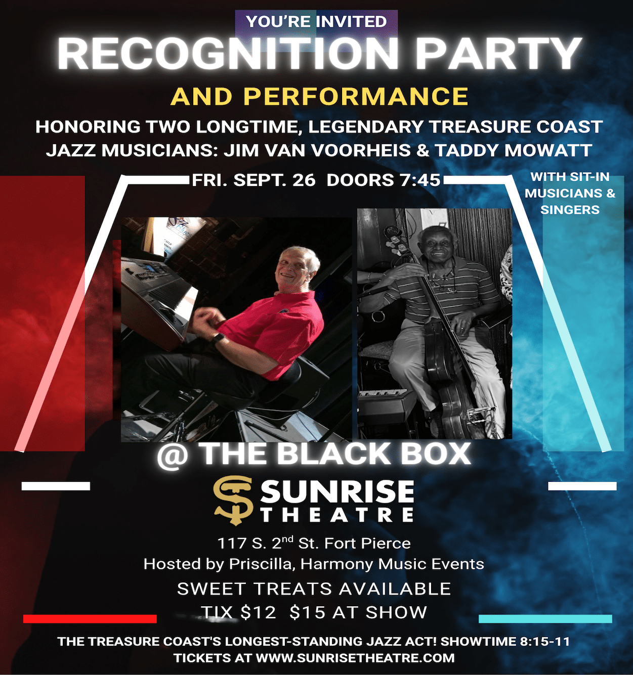 Join us as we honor, recognize, and celebrate two senior JAZZ MUSICIANS who have been playing for decades in the Treasure Coast. They’ve done countless shows and Jazz Jams, played at more than 40 venues, and brought the joy of Music to thousands of people!