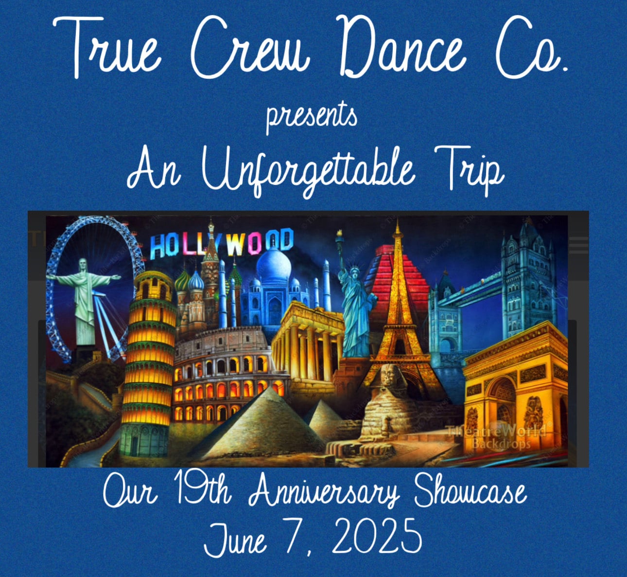 This year, for our 19th Anniversary, True Crew Dance Co. is taking you on an Unforgettable Trip. Our dancers, Recreational through Competitive will be performing a family friendly showcase that you will not want to miss. All forms of dance, musical theater, and performing arts will be showcased.